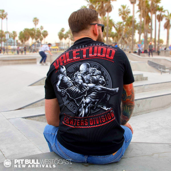 Koszulka Pitbull Vale Tudo to jeden z sześciu produktów nawiązujących grafiką do sportu. W tym modelu znajdująca się na plecach ilustracja przedstawia walczących ze sobą w stylu mma mężczyzn na tle loga producenta. Od góry i dołu natomiast umieszczone zostały napisy w kolorze czerwonym. O detale zadbano za pomocą biegnących wzdłuż linii ramion przeszyć oraz zlokalizowanej na przodzie koszulki, przy dolnym szwie naszywki opatrzonej znakiem firmowym. Na froncie, na wysokości klatki piersiowej widnieje także nadruk “Pitbull Sports”. Materiał 100% bawełna.